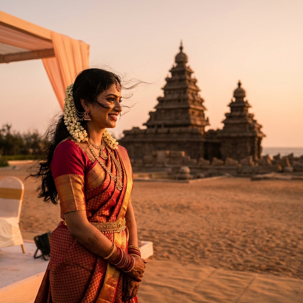 Planning a wedding in Mahabalipuram, Pondicherry, or beyond? We travel with you to ensure you look perfect. Our team is experienced in managing destination wedding logistics.